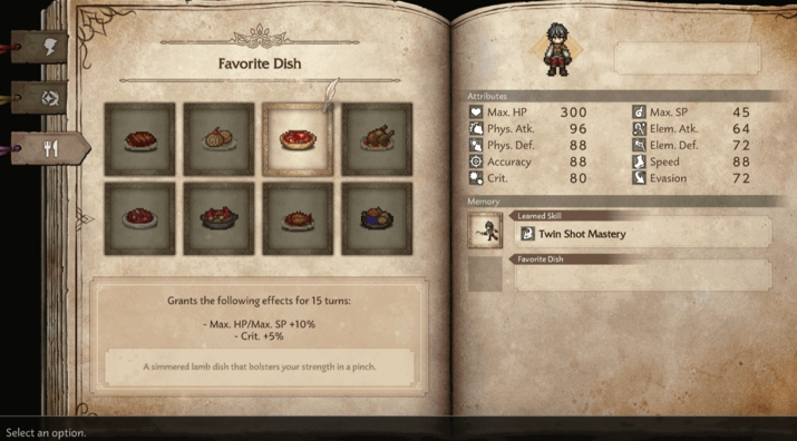 在《歧路旅人 0》的冒险序章中,玩家将迎来开局的首个关键选择 —— 从母亲提供的四款特色食物里,挑选出自己的 “喜爱食物”。这个看似简单的抉择并非单纯的剧情互动,而是会直接为角色提供持续 15 场战斗回合的专属增益效果,从根源上影响初期冒险的生存与输出体验,四款食物分别对应物理防御、物理攻击、元素攻击和最大 HP 这四项核心属性的提升,不同选择将适配截然不同的开局战斗风格。