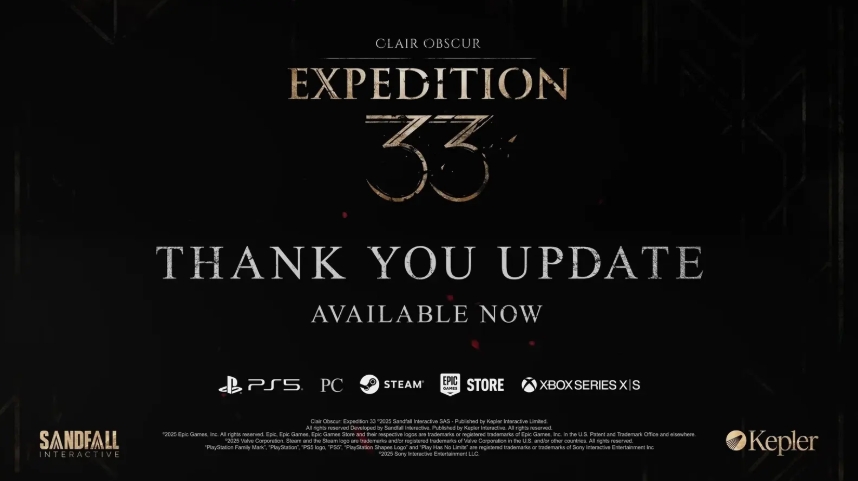 游戏界的双重重磅喜讯来袭!备受玩家喜爱的角色扮演游戏《光与影:33 号远征队》不仅正式推送了 1.5.0 版本更新,带来了名为 “感谢(Thank You Update)” 的诚意补丁,更在今日举办的 TGA 2025 颁奖典礼上创造了历史性辉煌 —— 一举斩获年度最佳游戏、最佳游戏指导、最佳叙事、最佳角色扮演游戏、最佳配乐 / 音乐、最佳艺术指导、最佳首发独立游戏、最佳表演、最佳独立游戏九项大奖,超越了过往所有作品的获奖纪录,成为 TGA 自 2014 年创办以来获得奖项最多的游戏,用实力书写了独立游戏的传奇篇章。